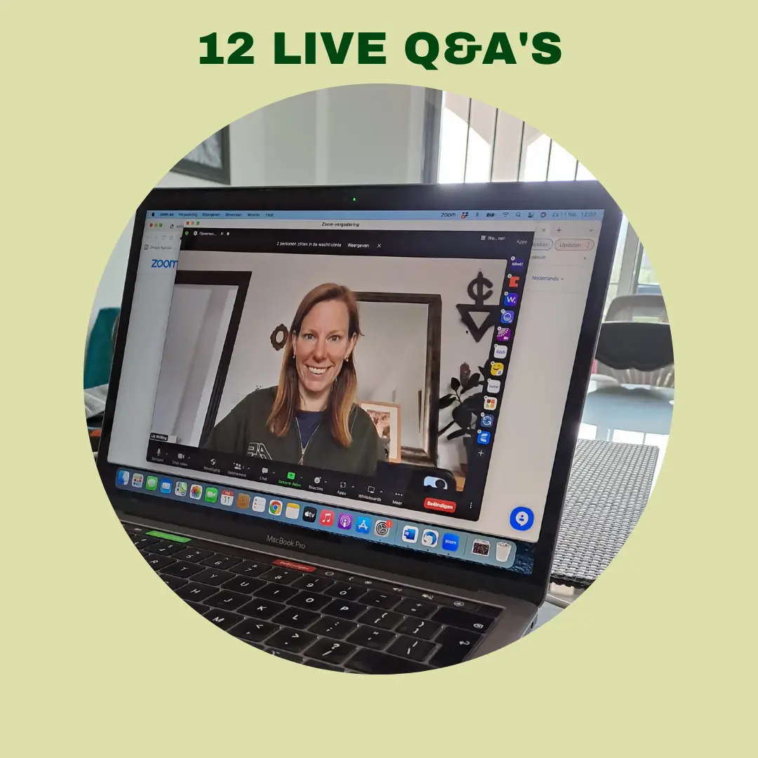 Naast alle informatie die je in de online database krijgt, zijn er ook 12 live Q&A's met mijzelf, waarbij je direct antwoord krijgt op al je vragen. Daarnaast krijg jij in dit persoonlijke coaching traject 24 121 sessies!